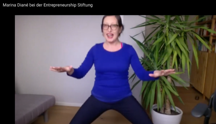 Marina zeigt den 58 Teilnehmenden einer Masterclass der Entrepreneurship Stiftung, wie sie trotz langen digitalen Veranstaltungen frei von Rückenschmerzen und hochkonzentriert bleiben können. Hier ist ein kurzes Video dazu: