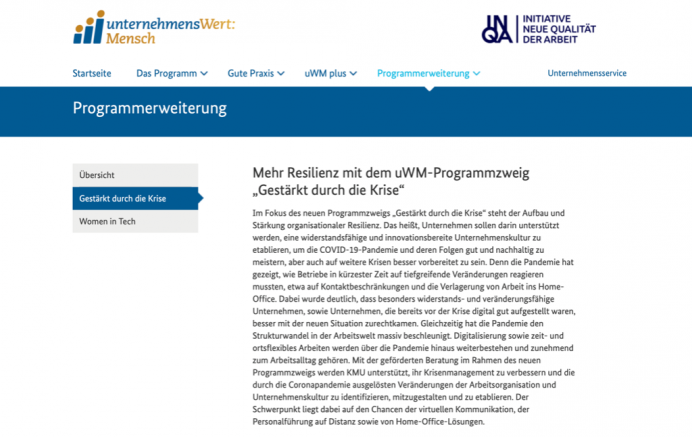 Der neue Programmzweig hilft Betrieben, sich künftig krisensicher(er) aufzustellen. Der Schwerpunkt dabei ist der Aufbau der unternehmerischen Widerstandskraft, um die Folgen der Pandemie erfolgreich zu meistern und auf künftige Krisen besser vorbereitet zu sein.