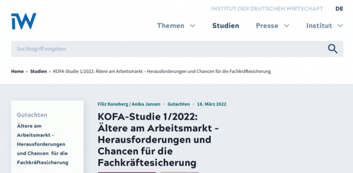 Koneberg, Filiz / Jansen, Anika, 2022, Ältere am Arbeitsmarkt – Herausforderungen und Chancen für die Fachkräftesicherung, Studie im Rahmen des Projektes Kompetenzzentrum Fachkräftesicherung (KOFA) in Zusammenarbeit mit dem Bundesministerium für Wirtschaft und Klimaschutz (BMWK), Köln: https://www.iwkoeln.de/studien/filiz-koneberg-anika-jansen-aeltere-am-arbeitsmarkt-herausforderungen-und-chancen-fuer-die-fachkraeftesicherung.html