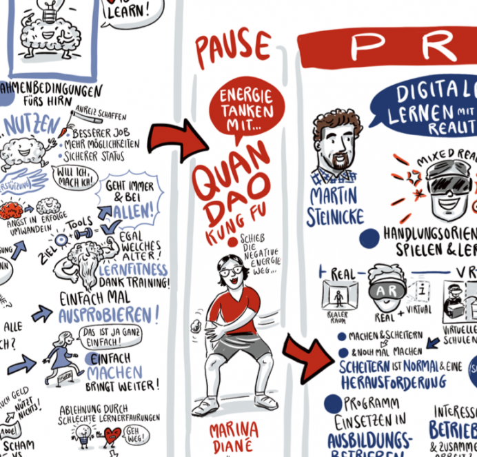 Marina Diané hat für die Motivation und Leistungsfähigkeit von 84 Teilnehmenden durch den Einsatz von Quan Dao Kung Fu Grunübungen der Kraft gesorgt. Barbara Schneider hat es durch tolles Graphic Recording visualisiert. Das komplette Bild und mehr Informationen über die Veranstaltung finden Sie unter https://www.lernen-mit-evideo.de/webkonferenz-lernmotivation-in-grundbildung/