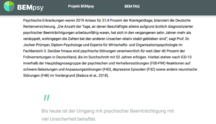 Im Projekt BEMpsy werden digital gestützte Tools und eine digitale Plattform im Kontext des Betrieblichen Eingliederungsmanagements (BEM, § 167 Abs. 2 SGB IX) entwickelt, um schwerbehinderten Beschäftigten oder deren Gleichgestellten die Inklusion und die Teilhabe am Arbeitsleben zu ermöglichen. Da die Anzahl an Arbeitsunfähigkeitstagen aufgrund psychischer Erkrankungen seit Jahren kontinuierlich steigt, fokussiert das Projekt einerseits auf die Eingliederung von psychisch beeinträchtigten Schwerbehinderten, andererseits auch auf die Eingliederung von schwerbehinderten Beschäftigten, denen eine psychische Beeinträchtigung droht.