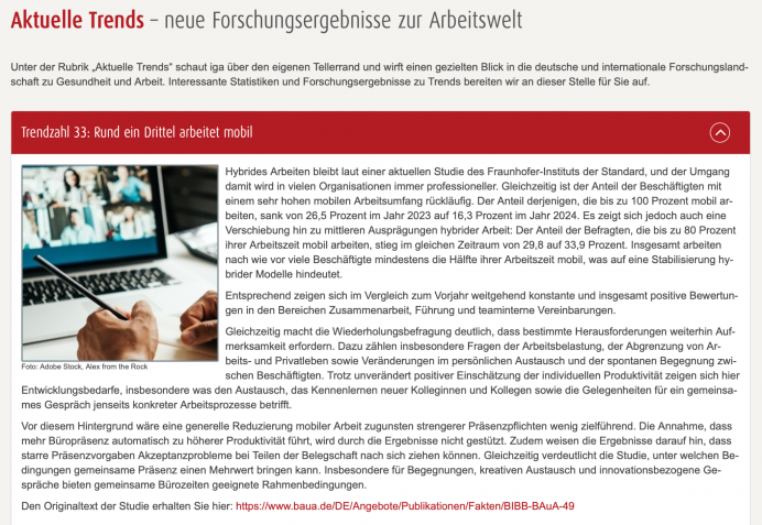 Die Initiative Gesundheit und Arbeit (iga) analysiert regelmäßig Entwicklungen in der Arbeitswelt und bereitet diese praxisnah für Unternehmen auf. Der aktuelle Trendbericht „Trendzahl 33“ bringt es auf den Punkt: