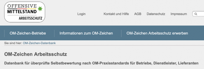 Unter www.om-zeichen.de können Unternehmen das „OM-Zeichen Arbeitsschutz“ erwerben und so mithilfe einer formal geprüften Selbstbewertung mit dem GDA-ORGAcheck (OM-Praxis A-3.1) ihren Arbeitsschutz inklusive der dazugehörigen Maßnahmen dokumentieren.
