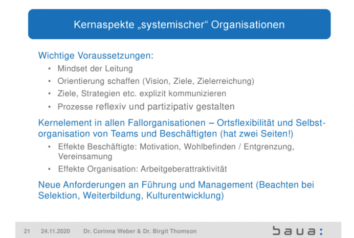 Im Webinar "Selbstorganisation und Reflexivität als Kernelemente von Organisation der Zukunft" im Rahmen der INQA-Webinar-Reihe https://inqa.de erläutern Fr. Dr. Corinna Weber und Fr. Dr. Birgit Thomson (Bundesanstalt für Arbeitsschutz und Arbeitsmedizin https://www.baua.de) drei Fallstudien. Vertrauen, Transparenz und strukturierte Kommunikationsräume spielen demnach bei zeitgemäßen Prozessen eine entscheidende Rolle. Das Verständnis von Führung und Management verändert sich zum Coach und Unterstützer, um Orientierung für die Mitarbeitenden zu schaffen und Prozesse reflexiv und partizipativ zu gestalten.