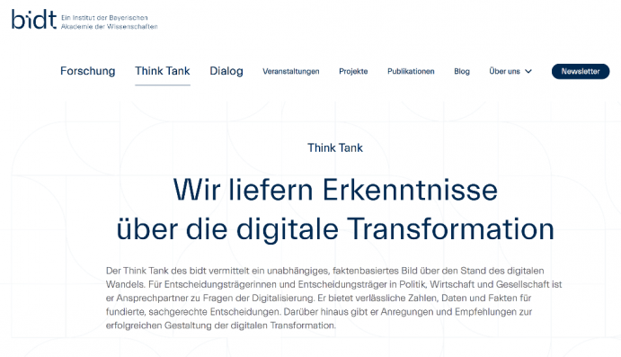 | Digitaler Wandel stellt uns von völlig neuen Fragen. Einen Überblick über Studien zum digitalen Wandel bietet das Bayerische Forschungsinstitut für digitale Transformation (bidt). | |